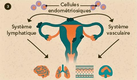 La propagation hématogène-lymphatique : des cellules endométriosiques sont transportées par le sang ou la lymphe jusqu’à des zones éloignées, comme les poumons. Cette hypothèse permettrait de comprendre certaines formes situées en dehors du bassin.