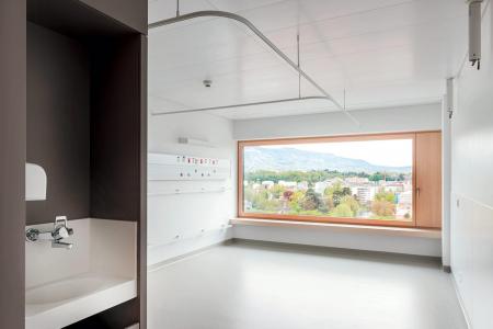 Avec des fenêtres qui descendent bas, la personne alitée jouit également d’une vue dégagée sur l’extérieur. Si pour les patients, c’est davantage de confort, pour les soignants, c’est un cadre plus intime facilitant le soutien émotionnel, l’empathie et la confidentialité. « Ce nouveau bâtiment est fidèle à notre vision des soins, centrée sur le patient. Aujourd’hui, nous avons construit l’hôpital autour de lui et pour lui. Prendre en considération les besoins humains, et non seulement techniques, est une priorité », résume le Pr Arnaud Perrier, directeur médical des HUG.