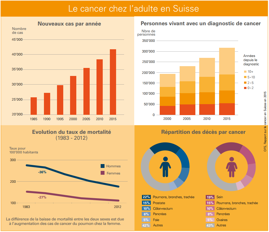Parler du cancer en 2016, c’est d’abord mettre en évidence un paradoxe. D’un côté, il y a une explosion de personnes qui vivent avec la maladie: 42’000 cancers ont été diagnostiqués en 2015 en Suisse et ce chiffre est voué à augmenter ces prochaines années. De l’autre, la mortalité a nettement diminué entre 1983 et 2012, baissant de 36% chez l’homme et de 27% chez la femme. Que doit-on comprendre ? « L’accroissement du nombre de cancers s’explique avant tout par l’évolution de la pyramide des âges et le vieillissement de la population, l’âge demeurant le facteur de risque le plus important. Quant à la baisse de la mortalité, elle est due notamment aux progrès thé- rapeutiques, au dépistage de certains cancers, à l’identification de prédispositions géné- tiques ainsi qu’à une meilleure information du public et à sa prise de conscience des bienfaits d’une bonne hygiène de vie », répond le Pr Pierre-Yves Dietrich, médecin-chef du service d’oncologie.