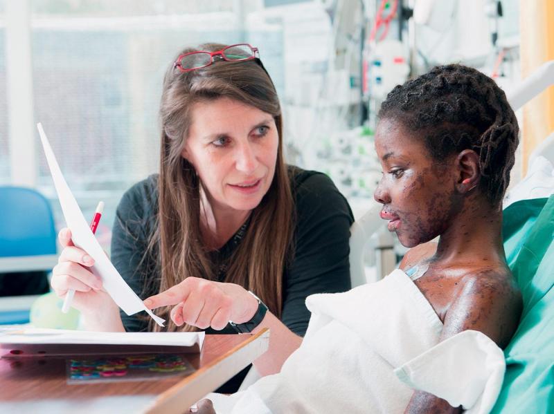 Aucune semaine ne ressemble à une autre, ce qui exige, de la part des enseignantes, beaucoup de souplesse et de créativité. L’enseignement se fait en chambre ou en classe, sous forme individuelle ou en groupe. Le français et les maths sont la priorité, mais d’autres matières sont aussi abordées au gré des besoins. « Parfois on applique le programme, parfois l’enfant, déprimé par sa maladie, a besoin d’autre chose. Alors, on écrit des poèmes ou on raconte des histoires, pourvu qu’il puisse s’évader de sa chambre par la pensée », décrit Barbara Marquis, enseignante spécialisée. Ce jour-là, elle s’occupe simultanément de deux enfants africains, opérés aux HUG grâce à des accords humanitaires. Ibrahima, 4 ans, n’est jamais allé à l’école. Ils ouvrent un cahier de vie qui racontera son séjour à l’hôpital, à l’aide de photos et de dessins. « G-A-M... », Gamalielle, 9 ans, s’entraîne de son côté à écrire les lettres de son prénom.