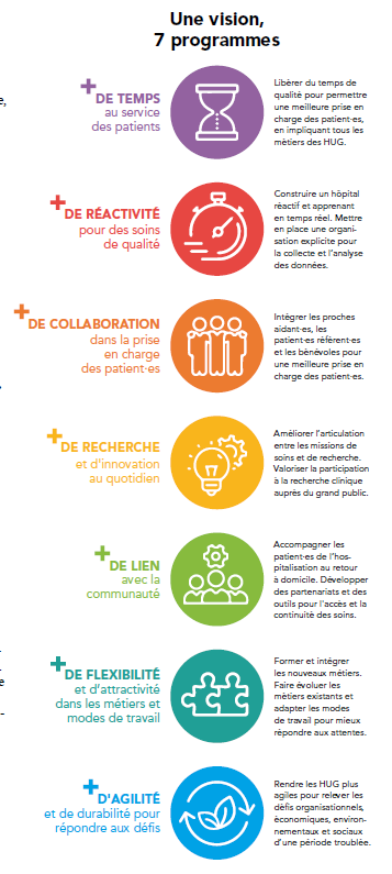 Et cela a marché. Clôturé en mai, le dernier plan a été couronné de succès. Partenariats avec les patient-es, inauguration du Centre de l’innovation, projets « Plus de temps pour les patients », sans parler des nouvelles valeurs relationnelles adoptées par les HUG… le plan stratégique Vision 20/20 a remodelé en profondeur le visage de l’hôpital. « Ce plan nous a appris à oser le changement. Maintenant, nous voulons oser autrement », appuie le Pr Geissbühler. En effet, un hôpital ne change pas de vision tous les cinq ans. Les axes structurants de Vision 20/20 demeurent : exceller avec les patients et les patientes, donner du sens à l’engagement, mieux travailler ensemble, affirmer la place des HUG dans le réseau de soins et se préparer pour le futur.