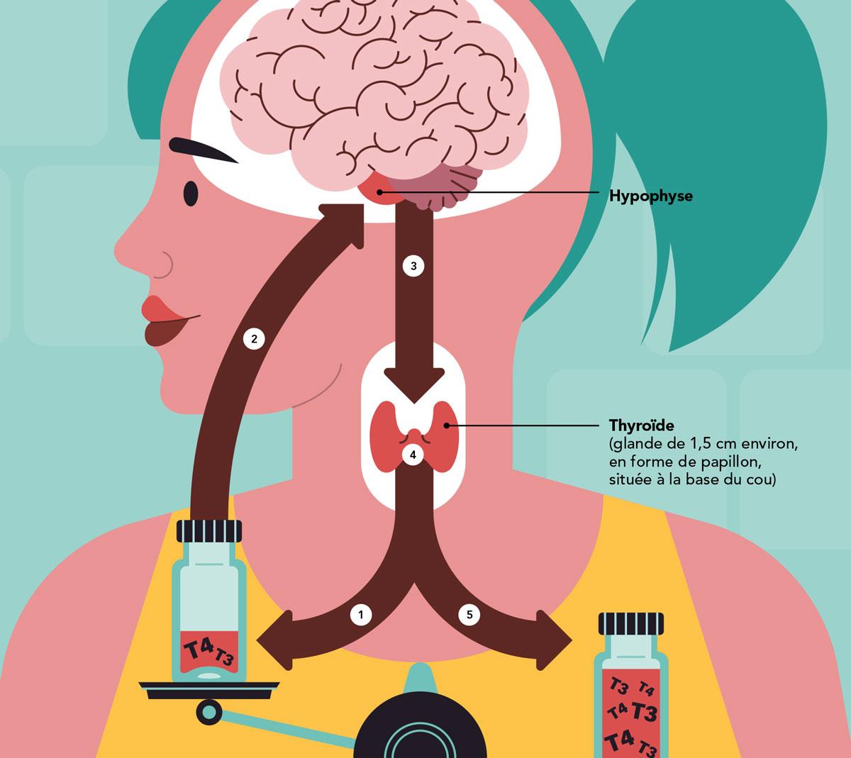 Tout au long de la vie, l’hypophyse, petite glande située à la base du crâne et productrice de l’hormone TSH (Thyroid Stimulating Hormone), stimule notamment la thyroïde qui va produire des hormones thyroïdiennes : la T4 (thyroxine), la plus abondante, et la T3 (hormone tri-iodothyronine). Celles-ci régulent la croissance, le développement et le métabolisme (utilisation d’énergie) du corps.