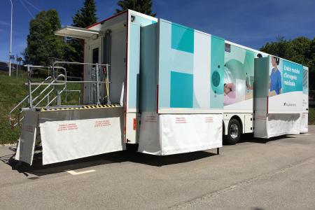 Véritable unité de radiologie roulante, ce camion et cette nouvelle remorque de 52 tonnes sont uniques en Suisse et permettront de doubler le nombre de patients examinés.