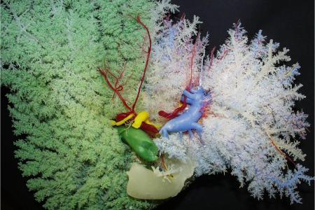Foie coloré par injection de résine dans les vaisseaux. En cas de split, la partie droite (en vert) est greffée à un adulte et la gauche, plus petite (en bleu clair), est utilisée comme greffon pour l’enfant.